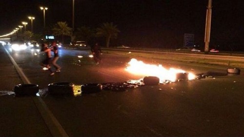 وعمد محتجون منذ عصر اليوم إلى قطع الشوارع الرئيسية، وتسبب قطع الشارع المؤدي إلى العاصمة المنامة من المناطق الجنوبية في ازدحام خانق استمر لقرابة ساعة كاملة.